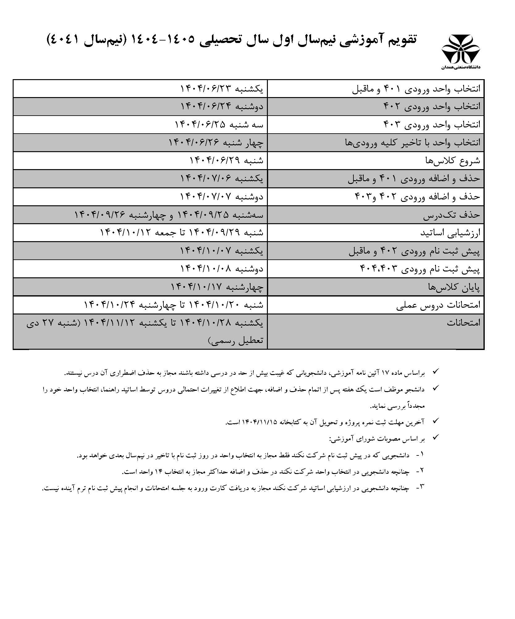 تقويم آموزشي نيمسال اول سال تحصيلي 1405-1404
